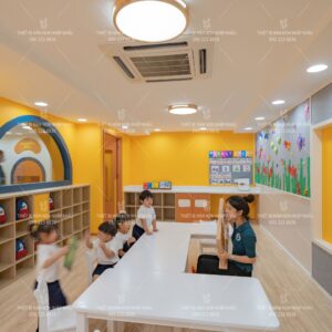 Thi công nội thất lớp học: bàn ghế, tủ kệ, sàn, trần, ánh sáng, vật liệu an toàn cho trẻ nhỏ.